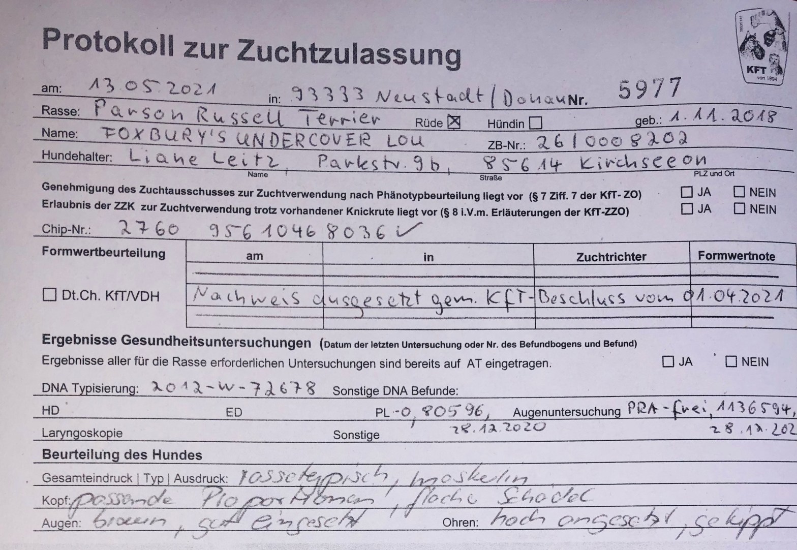 Lou wird als Deckrüde im KFT zugelassen. Richter Machetanz erteilt ihm die unbegrenzte Zuchtzulassung und stellt ihm ein tolles Zeugnis aus.