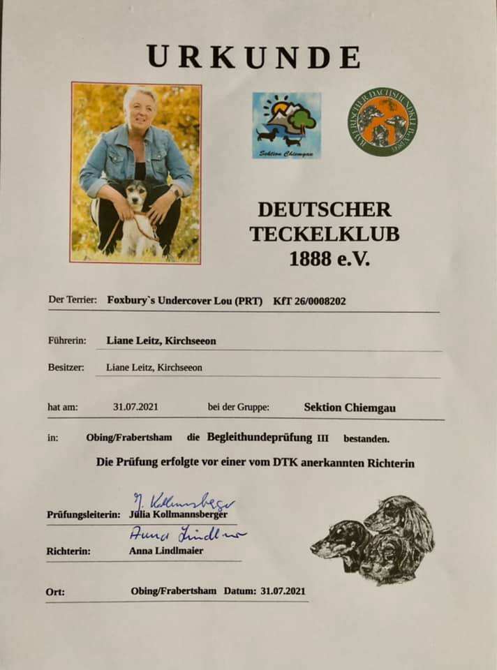 Am 31.07.2021 waren wir zu Gast beim Deutschen Teckelclub 1888 e.V. Sektion Chiemgau. Lou hat dort die Begleithundeprüfung Teil III abgelegt. Er erreichte die volle Punktzahl und erhielt den 1. Preis. Vielen Dank an die Prüfungsleiterin Julia Kollmannsberger, Richterin Frau Anna Lindlmaier und natürlich an den Teckelclub für seine Gastfreundschaft.